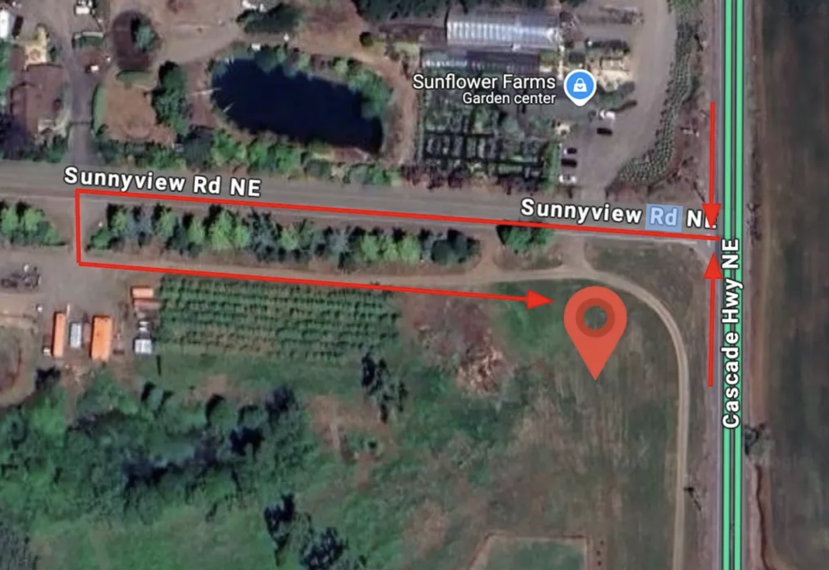 Heading south on Cascade Highway NE, turn right onto Sunnyview Rd NE, then take the first left onto a dirt road and immediately take another left. Follow the signs for event parking.